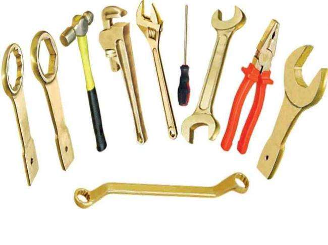 通常由鋼鐵材料制成的釬、鎬、錘、鉗、扳手、吊具等工具與設備在激烈動作或失手跌落時發生的摩擦、撞擊火花時隱蔽的點火源,因此在危險環境中安裝設備需要使用不發生摩擦及撞擊火花,甚至不產生熾熱高溫表面,由特殊材料制成的專用防爆工具。鋼鐵材料的硬度時隨含碳量的增加而提高的,而鋼鐵材料中的碳時產生摩擦火花的根源。防爆工具采用銅合金,在強度和硬度都較低的純銅中添加鈹、鋁、鈦、鎳、鎂等熔煉成銅基合金,強度和硬度得到提高,由于不含碳摩擦或撞擊時不會產生火花;銅合金的強度、硬度及導熱性都比鋼鐵材料好,局部摩擦點會發生塑性變形而避免摩擦能量集中在個別接觸點上,并且能將摩擦產生的熱量迅速分散到基體而減少摩擦撞擊點出現熾熱高溫的危險。當前工業上已由鉸青銅、鋁青銅、J892銅合金等多種銅基合金成功地應用在防爆工具中。防爆工具一般分為防爆手工具、防爆氣動和液動工具以及專用工具等,包括各種扳手、鉗子、錘鑿、刀具等。